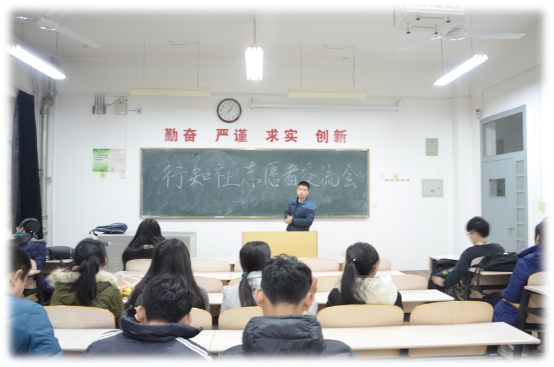 我院行知社于12月22日晚7点在3505教室举办了“行己所知,愿留余香”志青春,行公益系列活动的第二个活动----志愿者交流会。行知社社长黄瑞和副社长王婷、马丽珠出席了此次活动,行知社部分部员参与此次活动。行知社的主要干部与大一的社员们对在做公益活动时遇到的问题进行了交流。