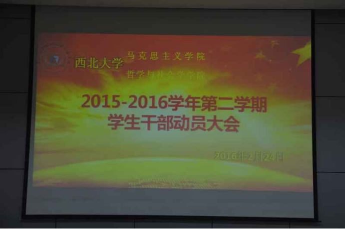 2016年2月24日下午两点,哲学与社会学学院于5106会议室召开了2015-2016学年第二学期学生干部动员大会。院党委书记马朝琦教授、院党委副书记李波老师、各班班主任老师、辅导员李鑫老师出席了会议。院学生骨干、研会骨干、党务工作小组全体成员、各班班长团支书及学生代表参加了会议。会议由院团委书记刘建波老师持。