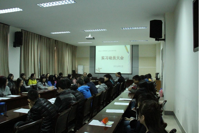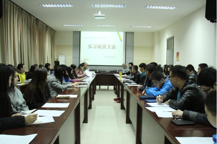 2016年2月25日上午10点,哲学与社会学学院于5106会议室召开2013级实习动员大会。院党委副书记李波老师,教学副院长王强教授,社会学与社会工作系系主任魏哲铭教授,哲学系系主任赵本义教授,带队老师齐钊老师、袁志伟老师,辅导员李鑫老师出席大会。2013级全体学生参加大会。大会由魏哲铭教授和赵本义教授主持。