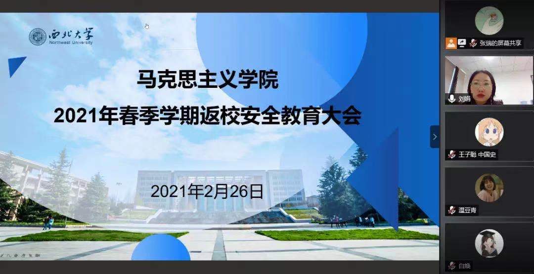 根据我校《西北大学2021年春季学期学生返校工作方案》部署安排,为保障学生安全、有序返回学校,我院2月26日上午召开2021年春季学期学生返校安全教育大会,全体研究生参加了会议,会议由辅导员刘娟主持。