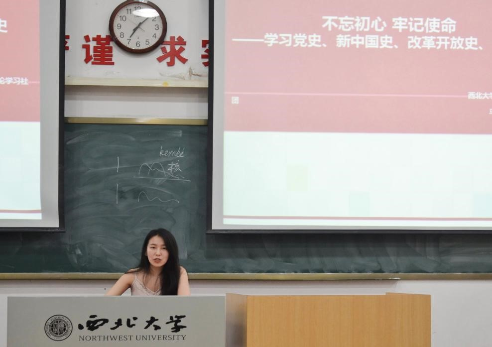 于佳丽以《不忘初心、牢记使命——学习党史、新中国史、改革开放史、社会主义发展史》为主题,从是什么、为什么、如何做三个维度就“四史”内容展开具体介绍,引导同学们增强四个意识,坚定四个信念,做到两个维护。