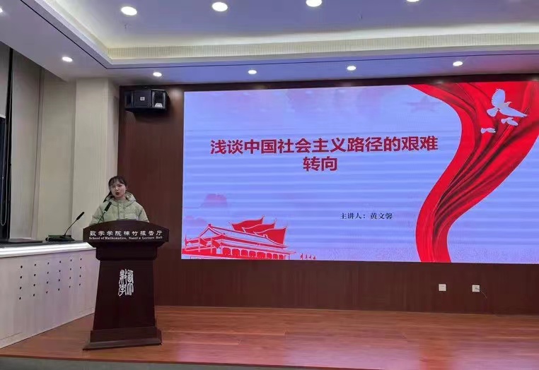 黄文馨同学以《浅谈中国社会主义路径的艰难转向》为题,从进行新民主主义革命、建立社会主义制度、实行改革开放等历史选择出发,阐释了“什么是社会主义、怎样建设社会主义”的历史逻辑,使大家的道路自信、理论自信、制度自信和文化自信更加坚定。