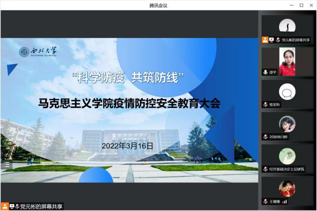 当前全国疫情形势严峻,为切实做好当前校内疫情防控工作,提高同学们在校期间的安全防范意识,维护广大师生的生命健康安全,3月16日下午,我院在线上召开了疫情防控安全教育大会,院党委副书记邵平、全体学生参加会议,会议由辅导员刘娟主持。