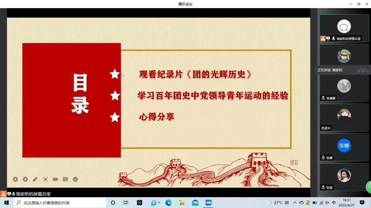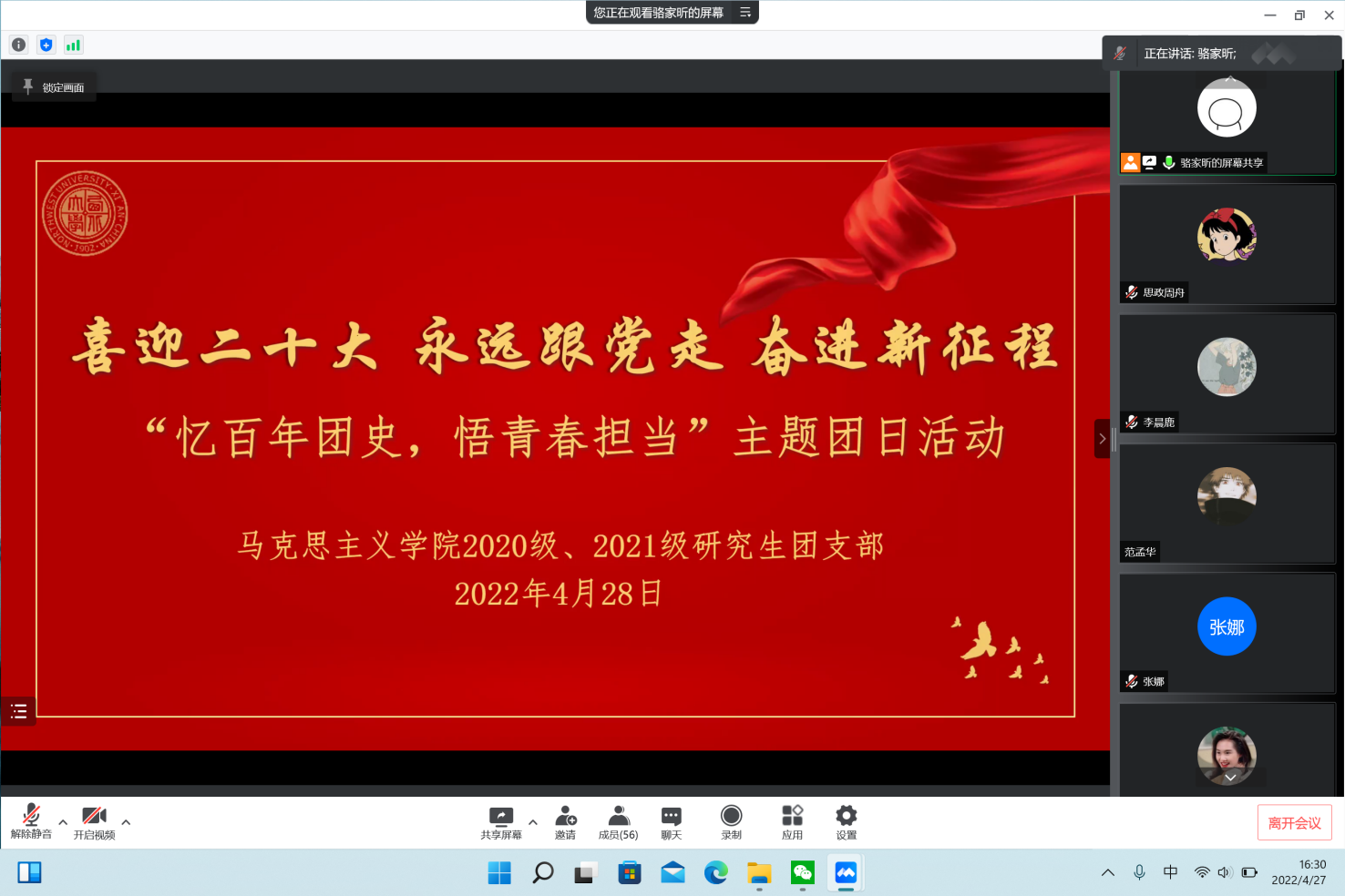 为引领我院青年团员深入学习百年团史,从团史中汲取前行力量,积极弘扬践行共青团百年奋斗精神,我院2021级研究生团支部结合“喜迎二十大,永远跟党走,奋进新征程”主题实践活动要求,于4月27日下午在线上开展了“忆百年团史,悟青春担当”主题团日活动。