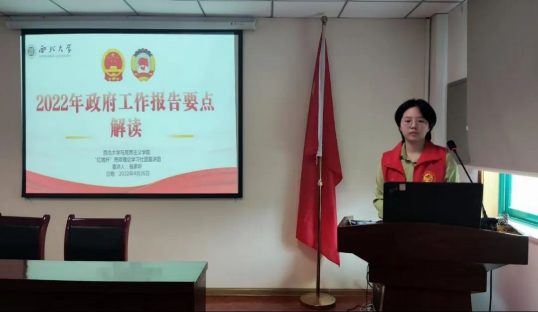 骆家昕同学的宣讲题目为《2022年政府工作报告要点解读》。她先带领大家回顾了过去一年我国政府工作情况和社会发展情况,以群众广泛讨论的话题为切入点,对报告的主要内容进行了整体性梳理,并总结了其中的经验做法。她提到,政府工作报告指出了经济社会发展的总趋势和政府工作任务,与广大党员干部群众的生活日常息息相关。因此,我们要加强学习,心系祖国,关心社会发展,爱岗敬业,做好自身的本职工作,从而为把握新发展阶段、贯彻新发展理念、构建新发展格局、推动社会高质量发展贡献智慧和力量。