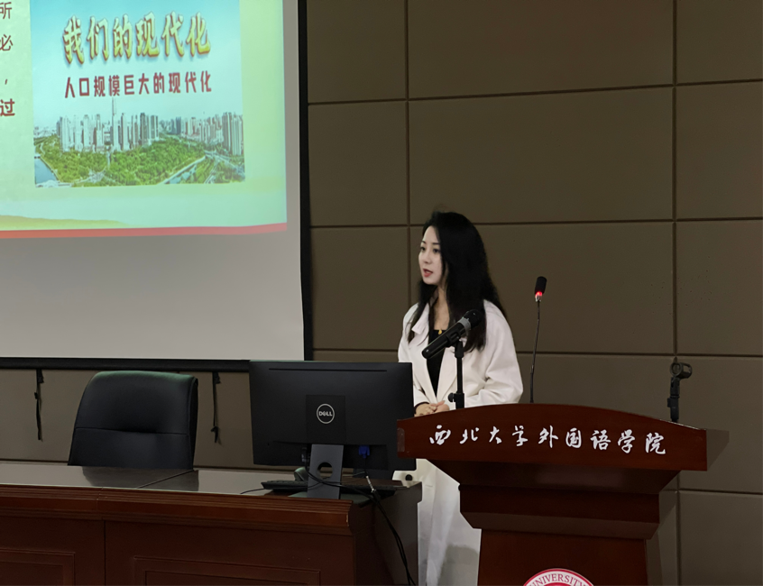 杨靖垭同学以《中国式现代化的内在含蕴》为题,向大家介绍了中国式现代化的特色、本质和原则,对比了中国式现代化和西方式现代化的异同,深化了同学们对中国式现代化新道路的认识,激励广大学子用奋斗为青春代言,用拼搏为谱写中国式现代化新道路新篇章贡献力量!