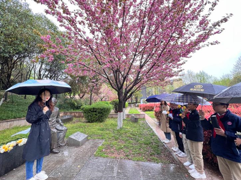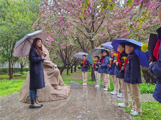 4月3日下午,在西北大学长安校区,“红桅杆”思政理论学习社团成员为来自长安区西北大学附属小学的少先队员们做了“童心向党寻足迹,薪火相传忆先烈”的主题宣讲。在水利学家李仪祉先生的铜像前,浦松洁向同学们讲述了先生远赴海外求学,回国后主持修建民国时期中国最大的模范灌溉区陕西关中“八惠渠”的事迹,以及他参加创办三秦公学为祖国培养水利工程技术人才作出杰出贡献;在侯伯宇先生的铜像前,武益帆为同学们讲述了先生一生从事于理论物理研究,将毕生精力献给了党和人民的教育和科学事业,为祖国的科学研究和人才培养鞠躬尽瘁的先进事迹。少先队员们为两位先生献上自己制作的纸花以寄哀思。
