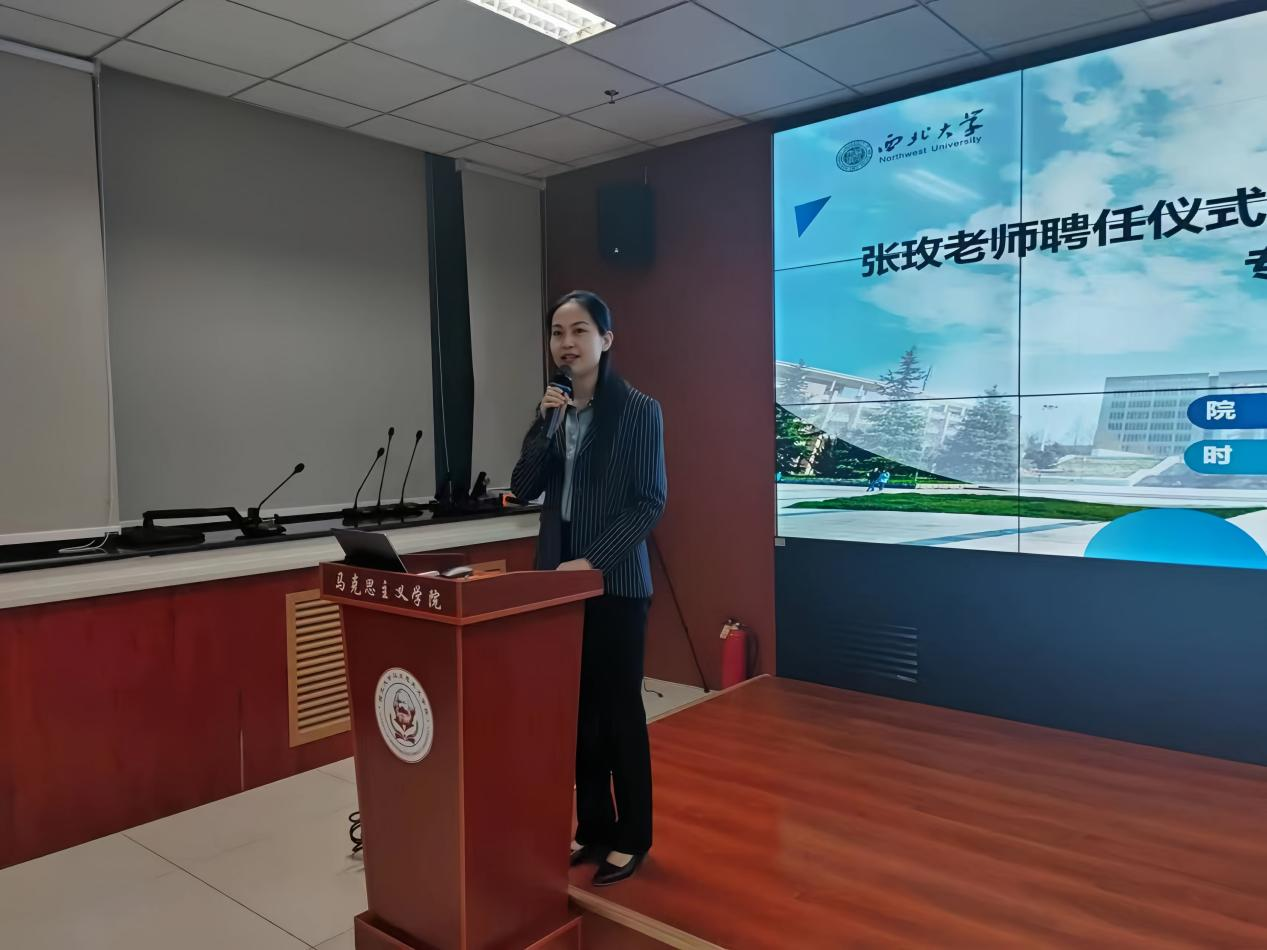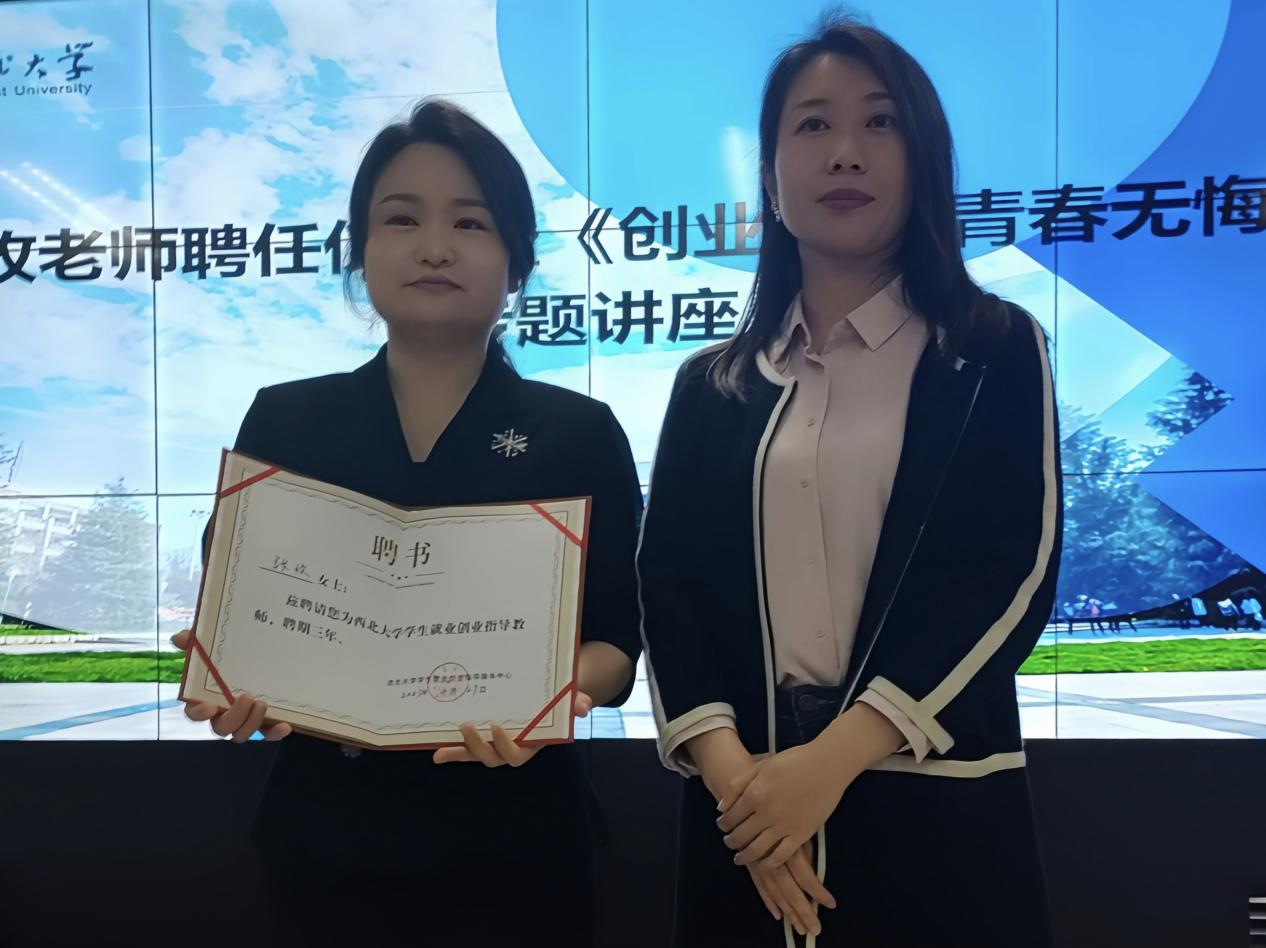 丁莹莹为张玫颁发西北大学学生就业创业指导教师聘书,邵平为张玫赠送纪念品。