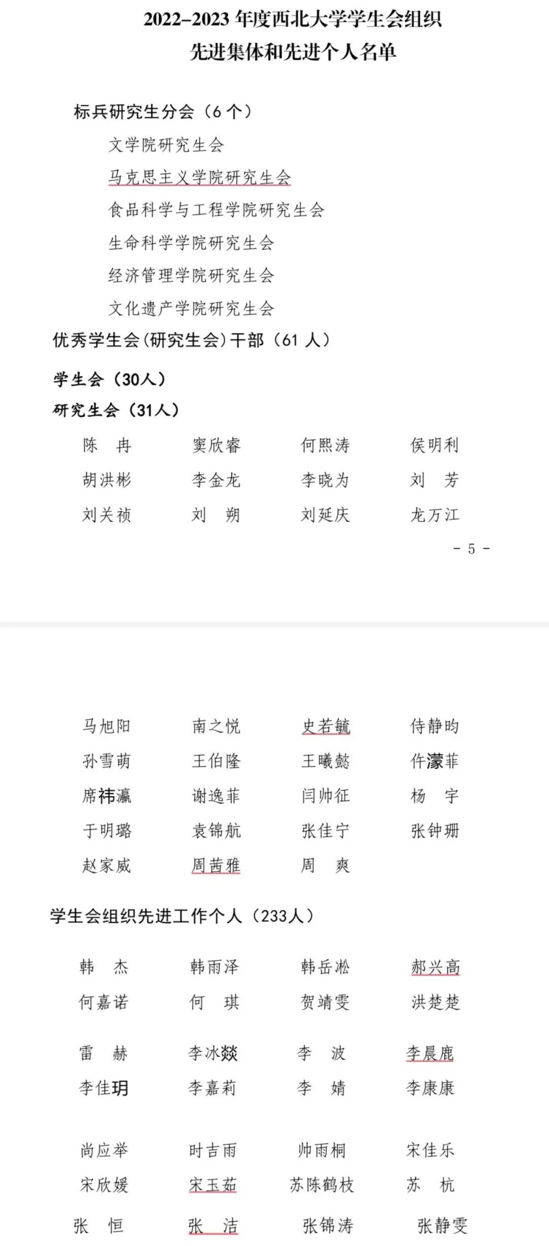 马克思主义学院研究生会在2022-2023年度西北大学学生会组织先进集体评比中以总评第二名的成绩荣获“标兵研究生分会”;在本年度西北大学学生会组织先进个人评比中,史若毓、周茜雅获“优秀研究生会干部”称号,郝兴高、李晨鹿、宋玉茹、张洁获“学生会组织先进工作个人”称号。