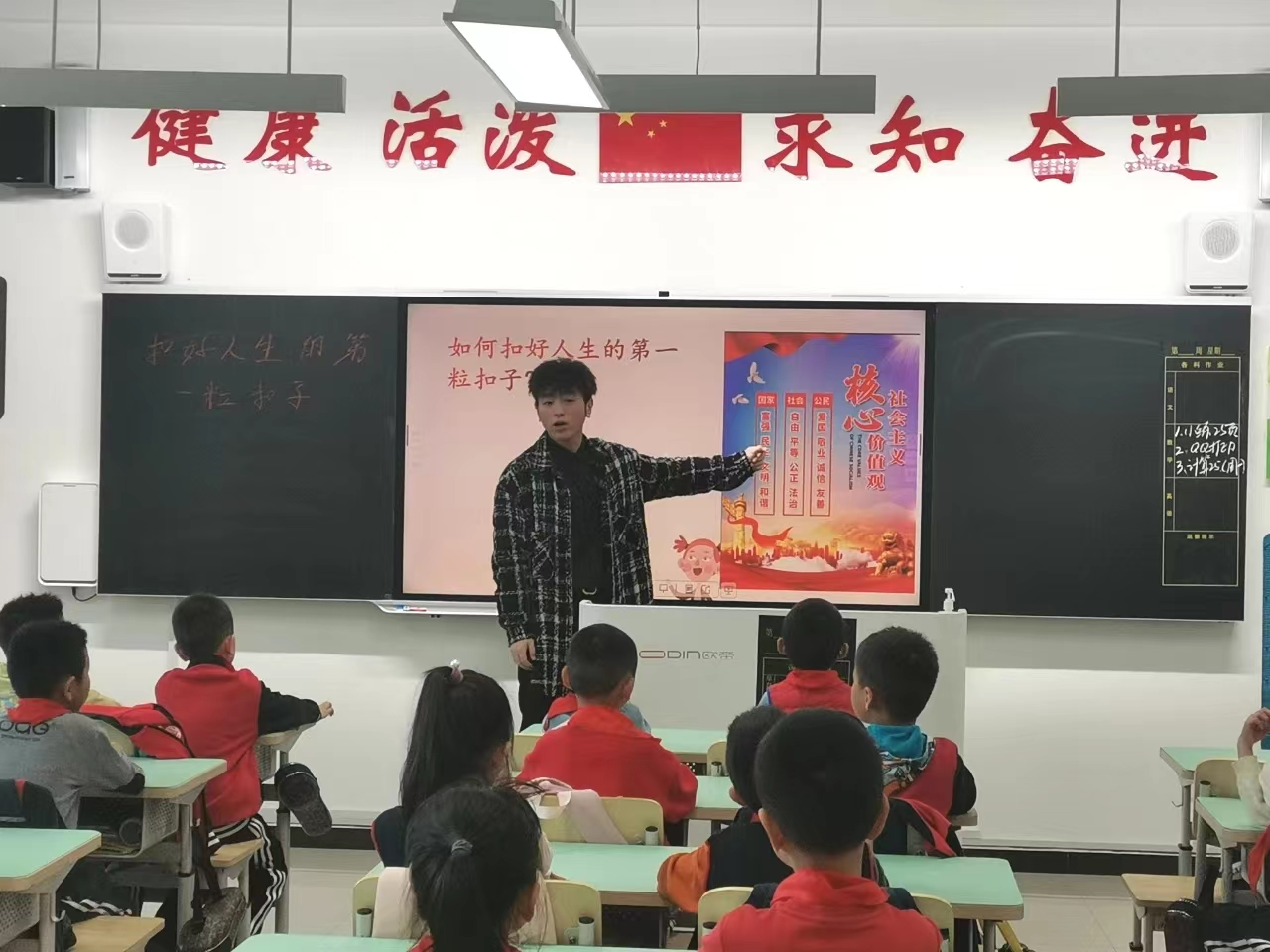 田丰以《扣好人生第一粒扣子》为题,通过生活中司空见惯的扣扣子的事例,使同学们感悟价值观在人一生成长中的重要作用,理解做新时代好少年就是要从小践行社会主义核心价值观。