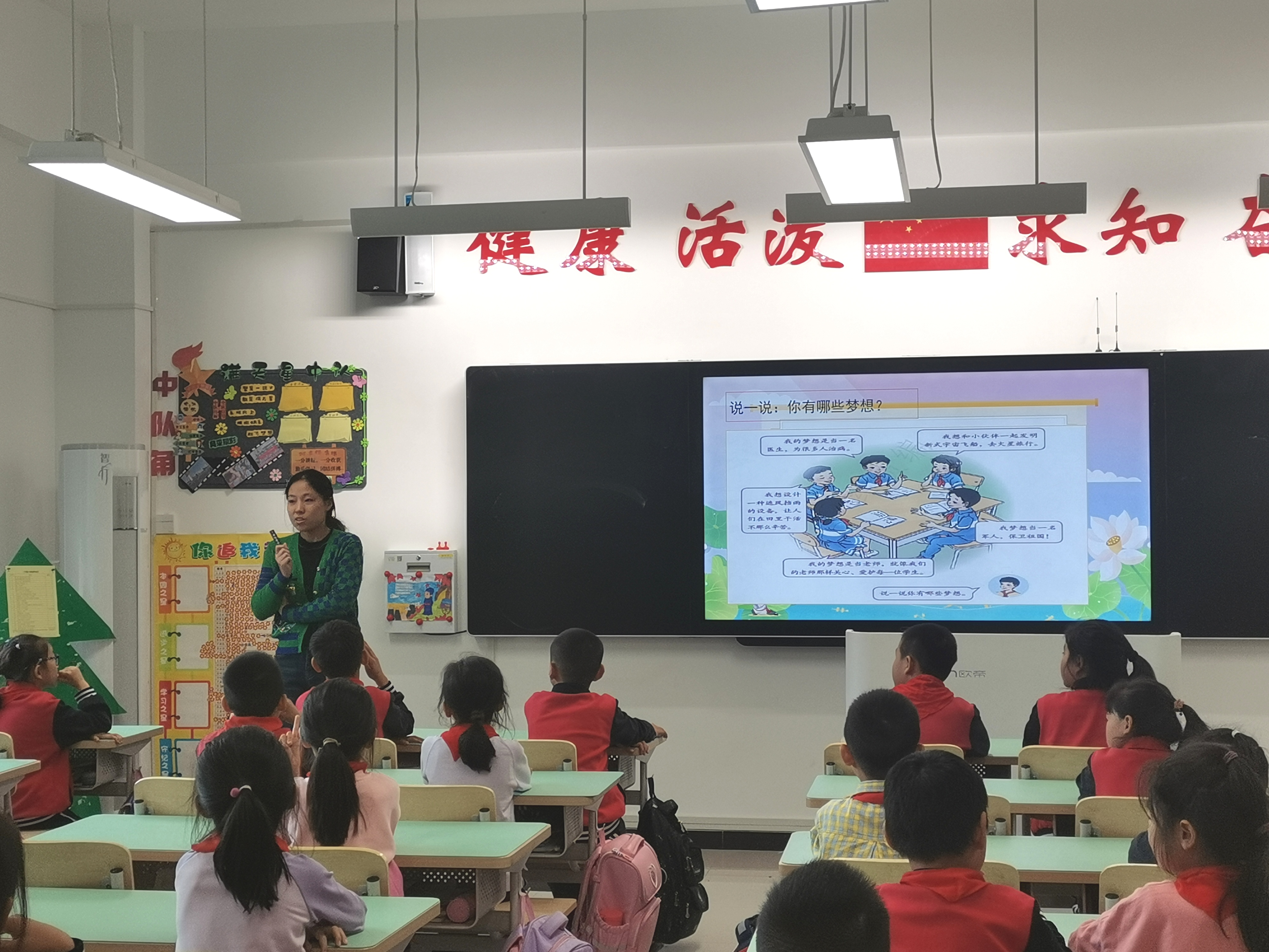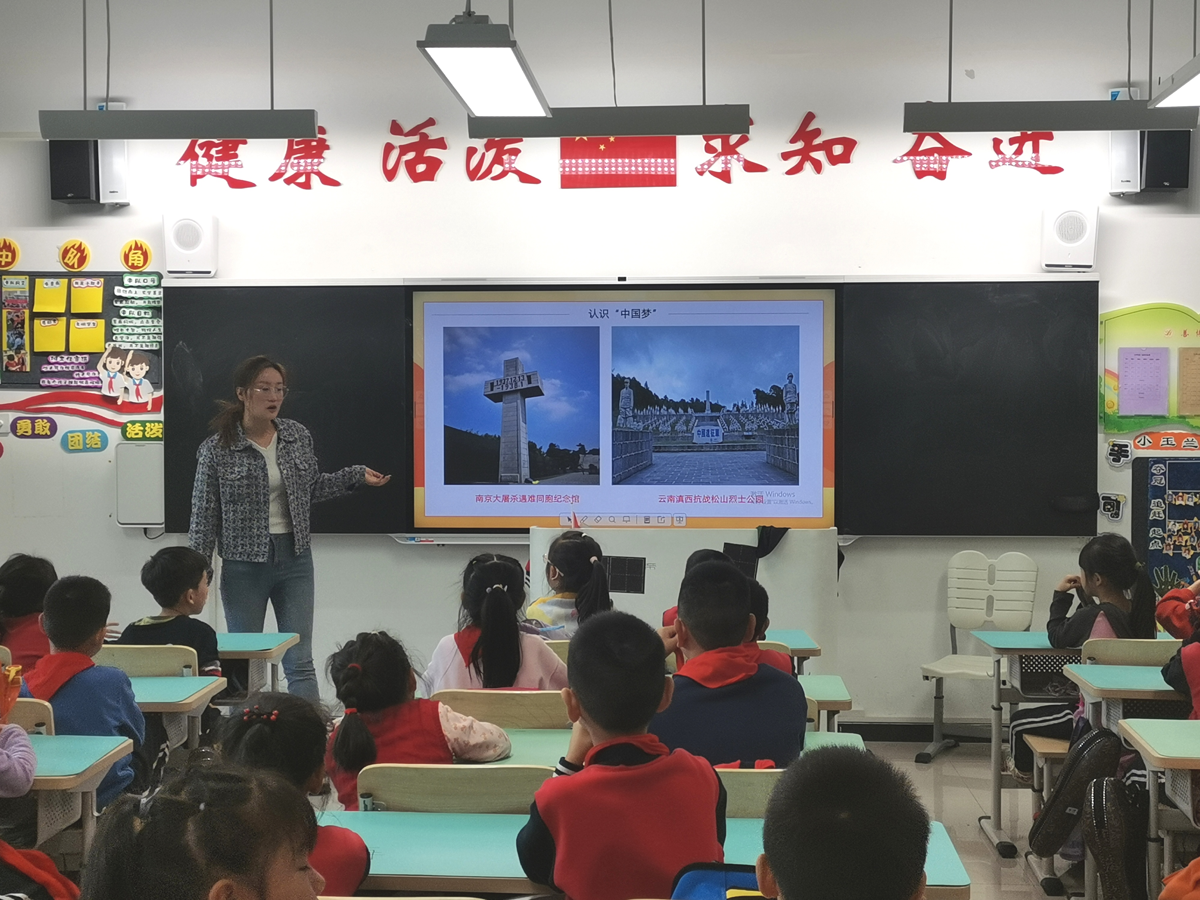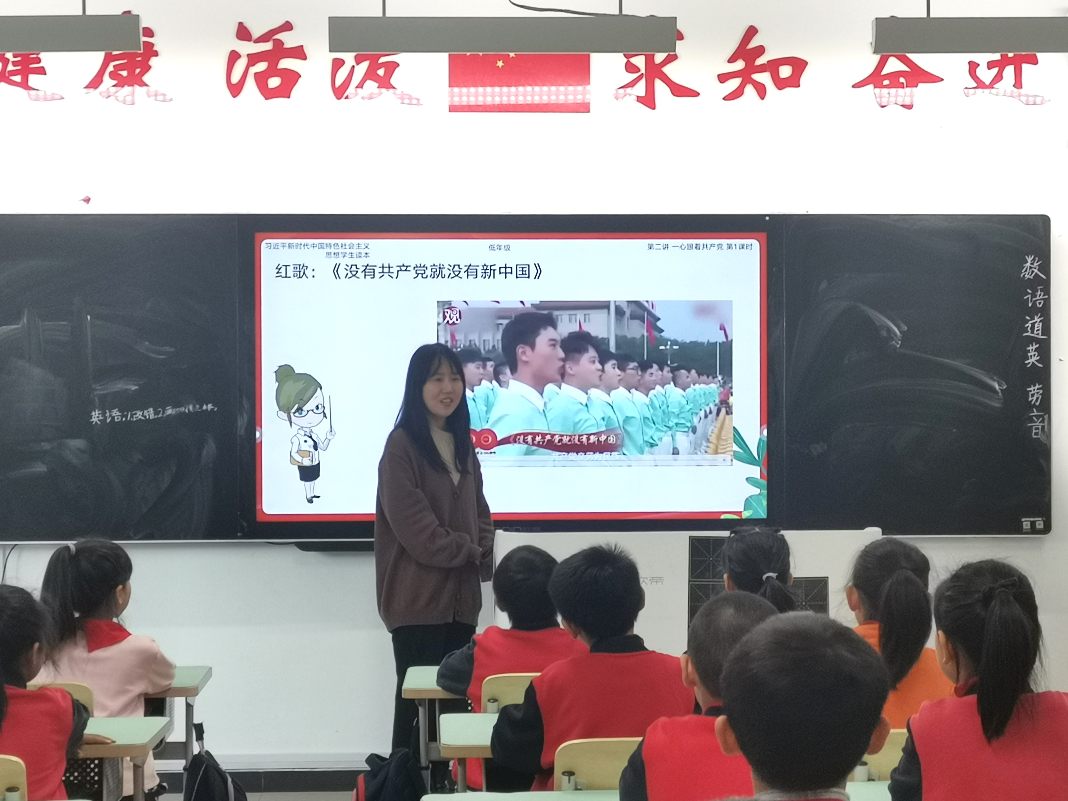 高美娟以《没有共产党就没有新中国》为主题,对中国共产党的成立和新中国的建立做了讲解,并帮助同学们理解了国旗和党旗的含义,更加深入地认识了党和国家的关系。