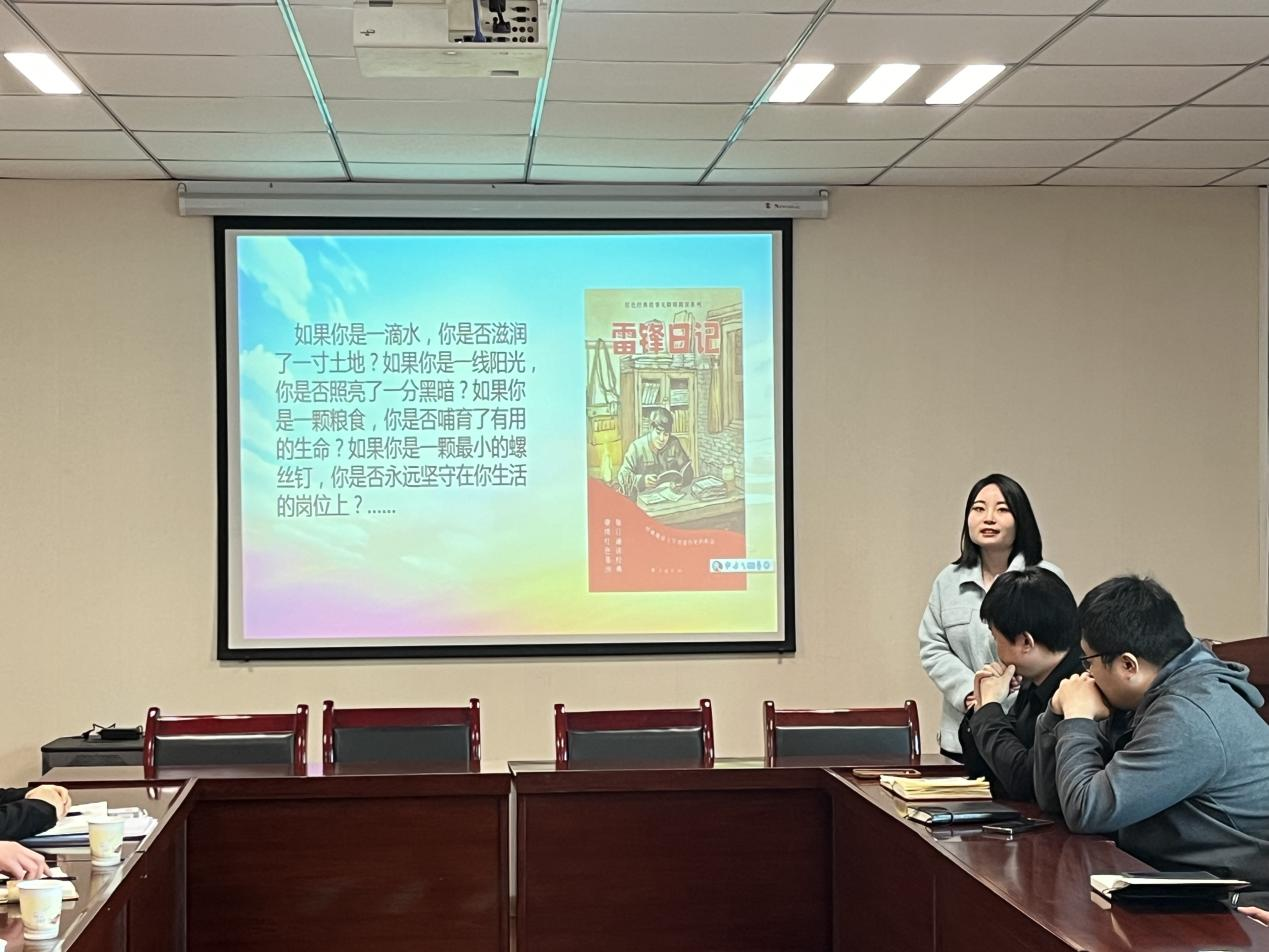 岳政远以《学习雷锋精神—为实现中国梦提供强大的精神动力》为题,从雷锋日记出发,介绍了雷锋生平及雷锋精神的内涵。随后结合习近平总书记的话语,引导广大党员以实际行动传承雷锋精神,从身边小事做起,不断提高自身的社会责任感。
