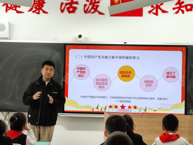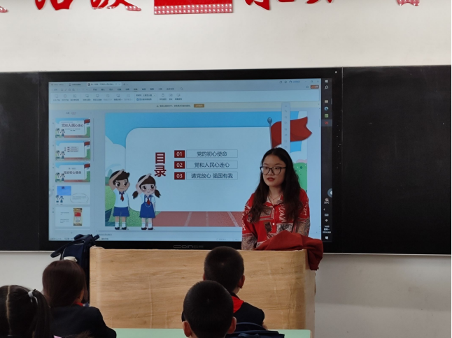 王金富以《没有共产党就没有新中国》为题,为同学们讲述了中国共产党成立的相关党史小故事,鼓励同学们要好好学习,天天向上,争做社会主义的建设者和接班人。