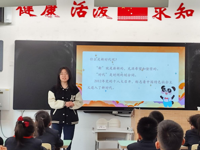 马雪凝以《新时代新生活》为题,展示了不同时期人们生活的方式,让同学们感受新时代的生活变化。呼吁同学们,作为国家的小主人公,要做到学做并行,以昂扬的姿态与时代进步同行。