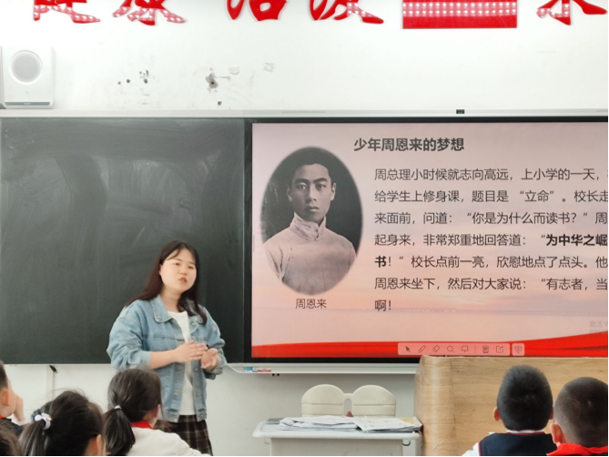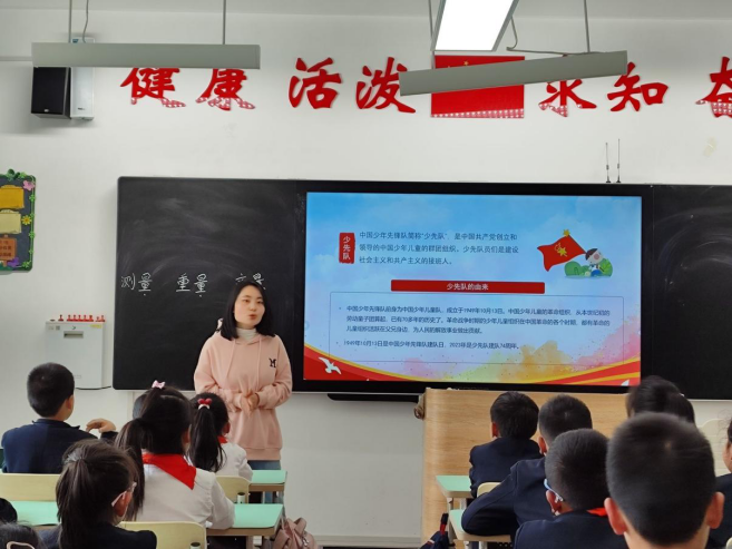 燕卉雅以《光荣的少先队》为题,借助歌曲导入,讲解了少先队的相关知识,倡导同学们从小树立远大理想,明确努力方向,让胸前的红领巾更加鲜艳。