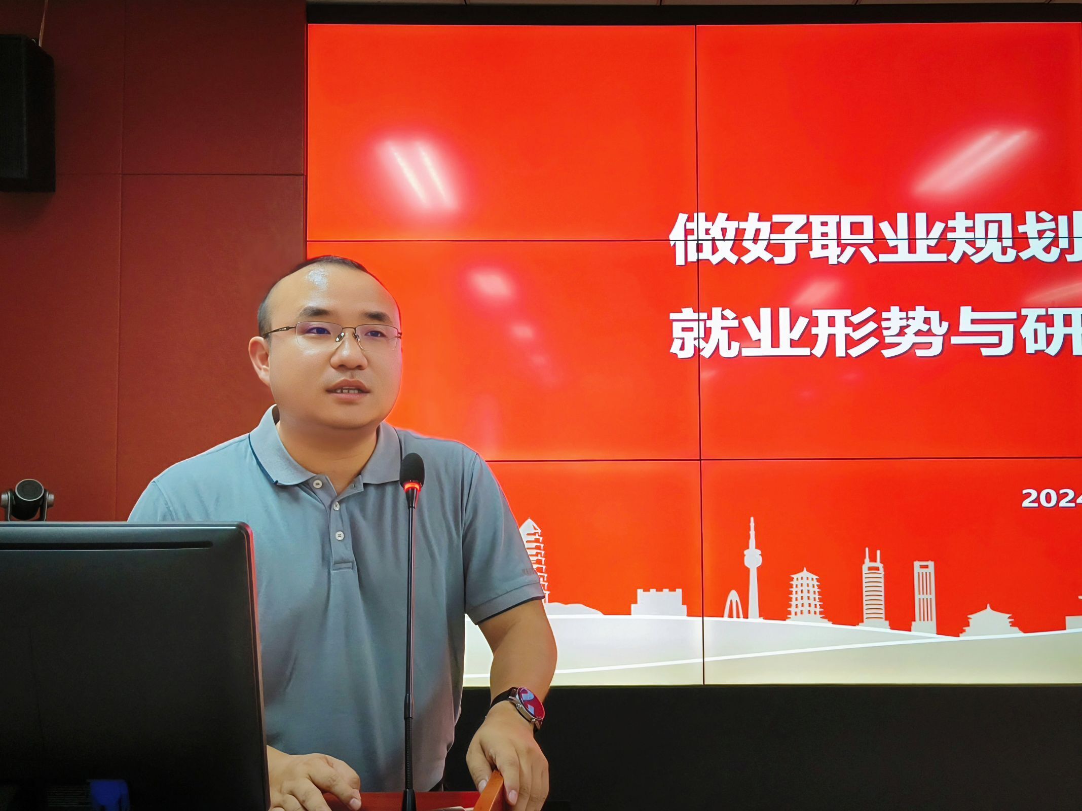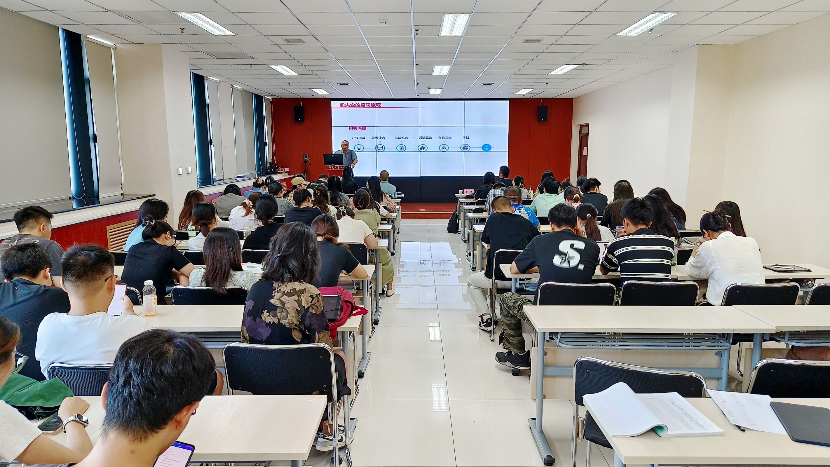 活动伊始,贾陆从国家人才战略、研究生就业形势分析、中央企业招聘与应聘技巧、研究生职业生涯规划和中国移动招聘介绍五个方面为同学们展开专题讲座。首先,他从近年就业情况、院校毕业生情况、毕业生就业数据、马克思主义学院毕业生主要就业方向等方面为大家分析了当前就业形势,引导大家树立正确就业观念,把握就业机遇,抓住秋季招聘黄金期。其次,他为同学们详细介绍了央企招聘流程,从简历制作、目标确定、形象打造、笔试准备、面试技巧等方面鼓励毕业生提前为企业招聘做准备。最后,他勉励同学们尽早做好职业规划,确定自身职业目标与成长计划。