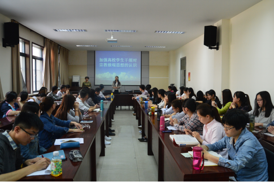 文岩副教授从五个方面详细为与会老师和学生干部讲解了宗教极端主义的由来、特征、表现形式以及作为大学生的应对办法。她说,近年来在境外势力的煽动下,宗教极端主义有在高校传播的趋势,这已引起全社会的广泛关注。但是光靠学校和社会的力量是不够的,还需要各位学生尤其是学生干部扮演“朝阳群众”的角色,要运用适当的方式方法同这种现象做坚决斗争。但这是要在保证学生自身安全的前提下进行的。