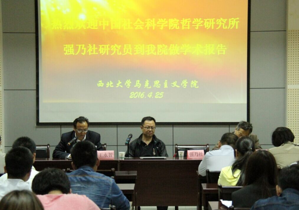 2016年4月25日晚,由西北大学哲学与社会学学院主办的学术报告在5号楼一层会议室成功举行。中国社科院哲学所的强乃社研究员应邀为我院师生作题为“当代马克思主义哲学视野中的都市社会”的学术报告。本次报告由学院副院长王永智教授主持,哲学系系主任赵本义教授作点评。
