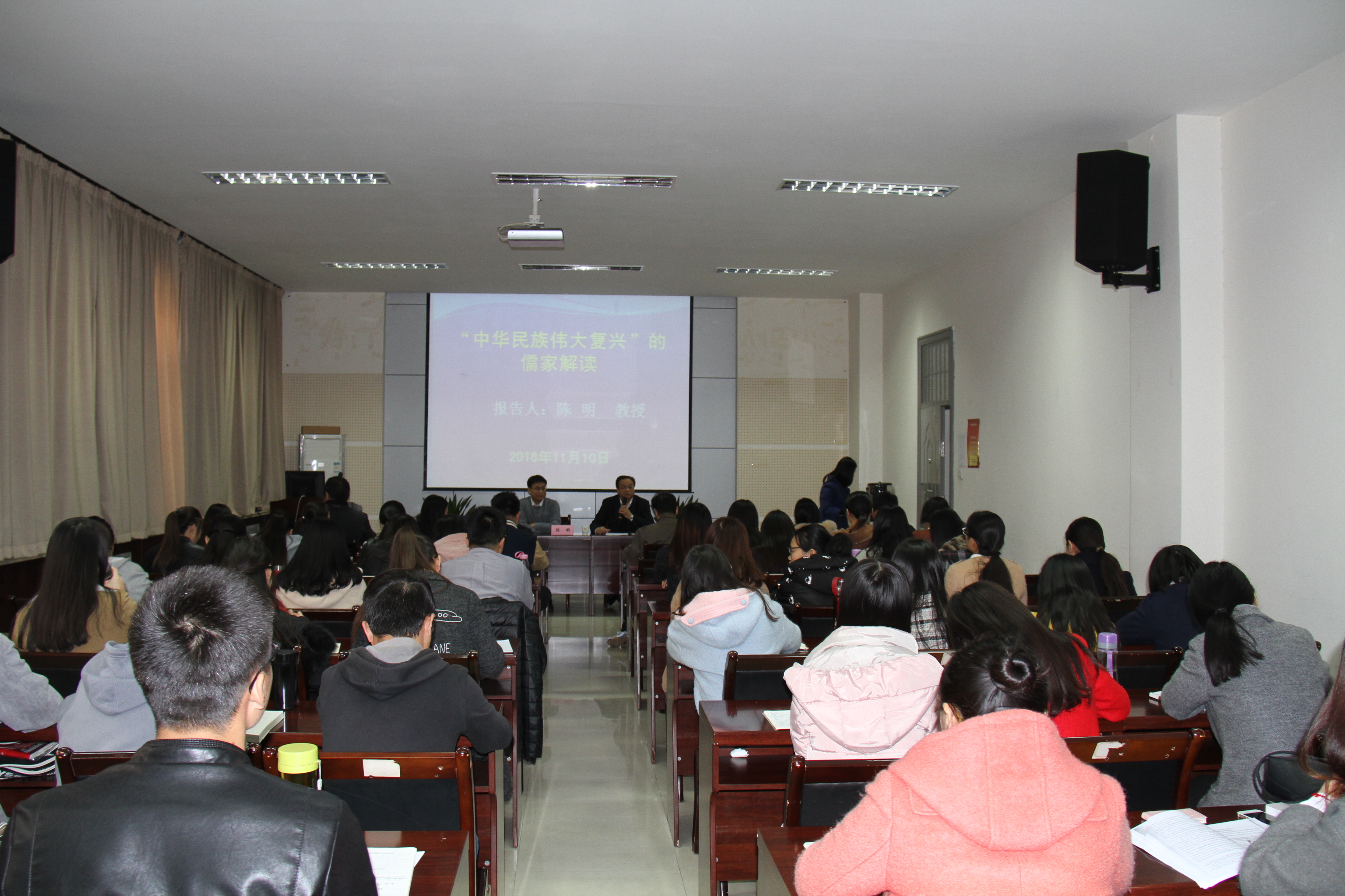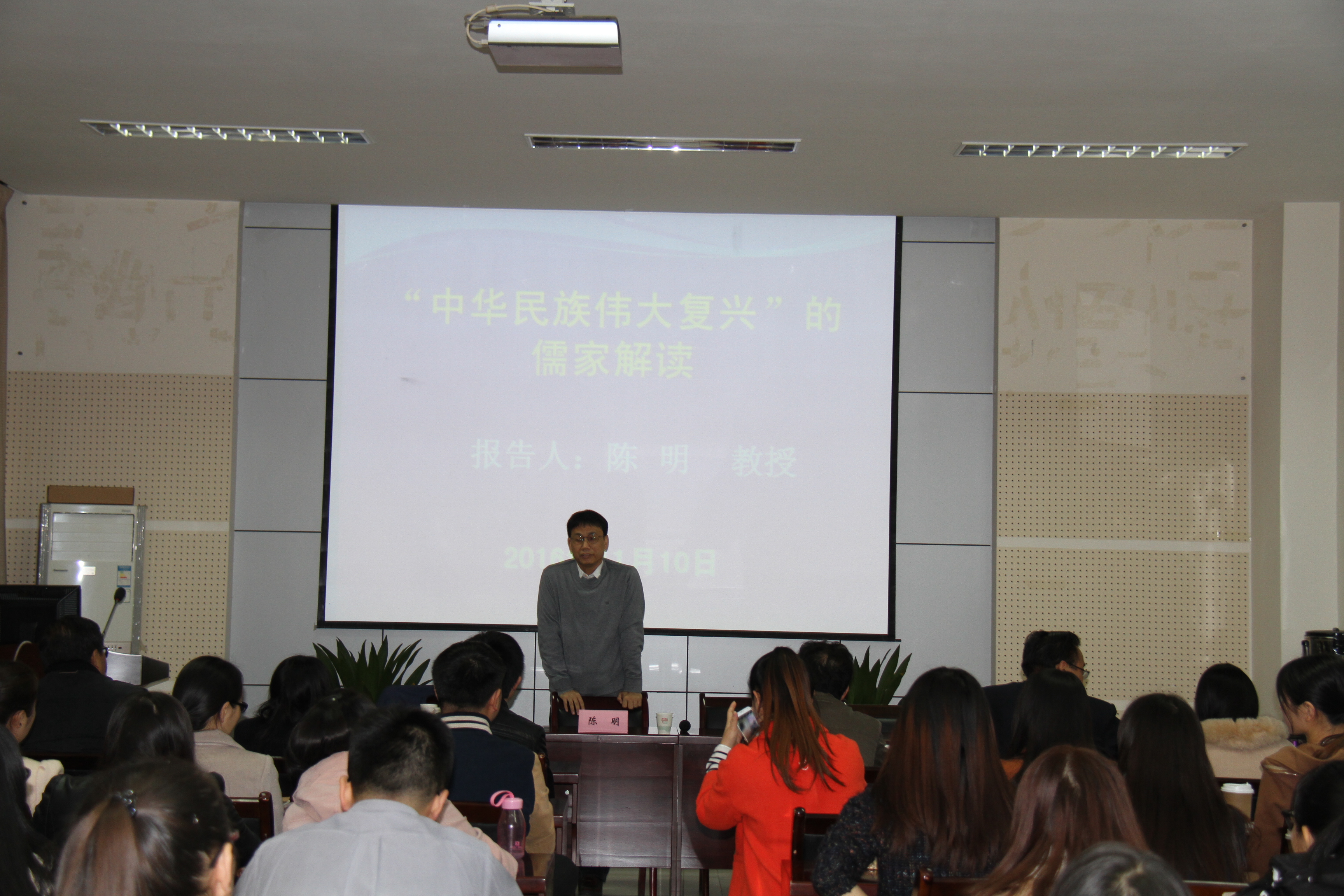 2016年11月10日下午,马克思主义学院邀请著名学者陈明教授讲授了题为“中华民族的伟大复兴:中国梦的儒家解读”的学术报告。陈明教授是中国大陆“新儒家”代表人物,现为首都师范大学儒教研究中心主任、哲学系教授,《原道》系列学术刊物主编。