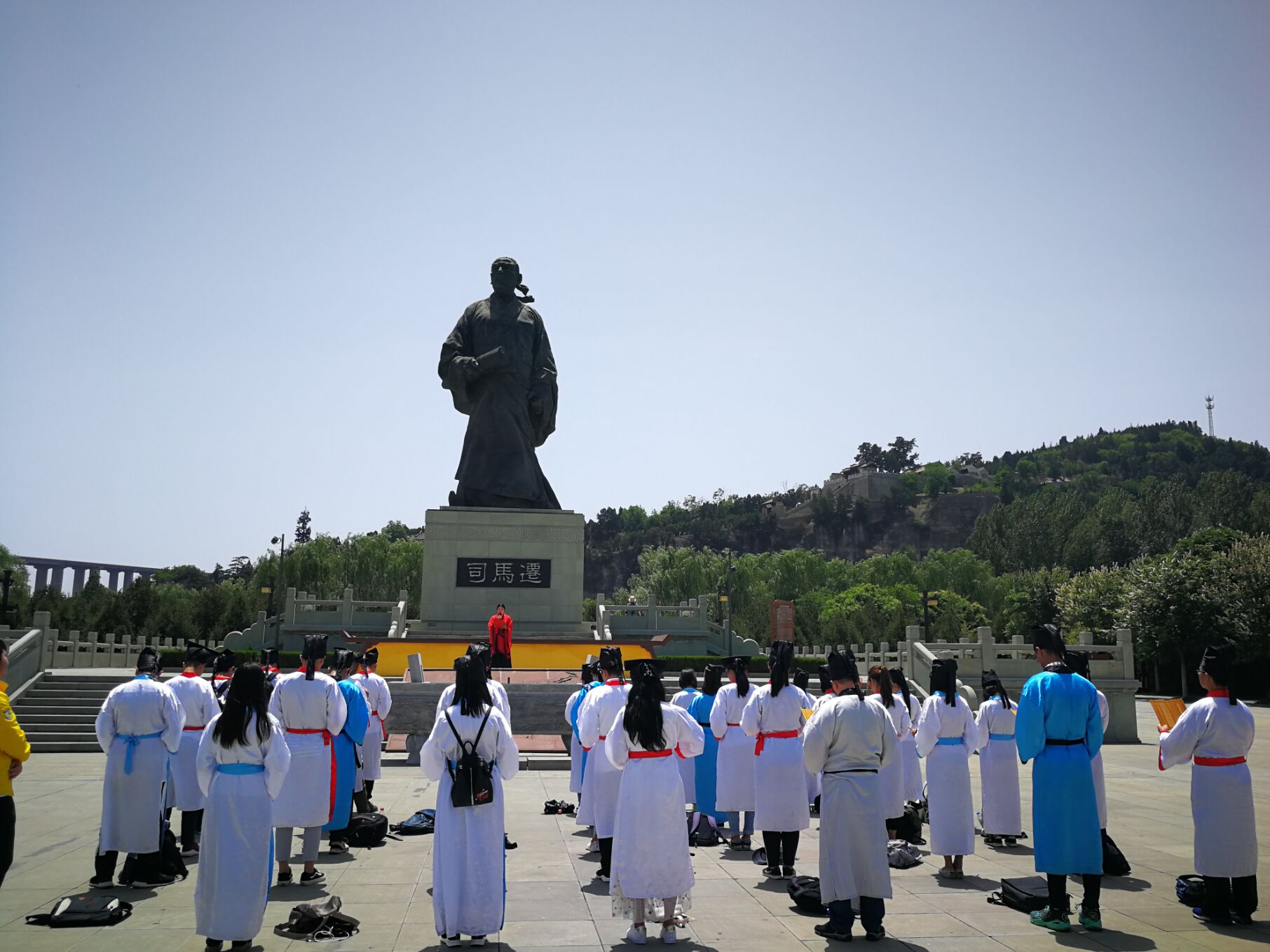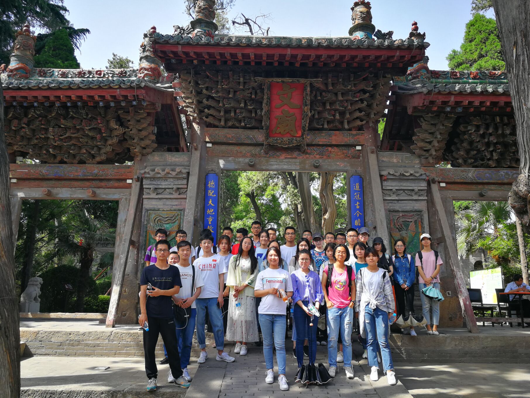 本次实践教学的第一站是司马迁祠。司马迁祠坐落在韩城市南10公里芝川镇的韩奕坡悬崖上,始建于西晋永嘉4年,是为纪念我国著名史学家司马迁而建的祠墓。在到达目的地后,同学们首先进行了“穿汉服,祭史圣”的体验活动,全体同学身着汉服,整齐站立在司马迁祠广场上,面朝史圣,声情并茂地朗诵太史公名篇《报任安书》,用声音回顾经典,重温司马精神。随后,同学们沿着古道登上陡坡,拜谒史圣的祠墓,在袁志伟老师的讲解下,同学们对司马迁和史记都有了更深入地了解。之后,老师同学们来到本次实践教学的第二站——韩城三庙,同学们先后游览了文庙、东营庙、城隍庙,欣赏了丰富的馆藏,领略了古建筑之美。虽然当天烈日炎炎,但同学们的求知热情并未减退,大家自始至终都在认真聆听和思考,并且为中国古代建筑和宗教艺术的魅力深深吸引。活动结束后,同学们都意犹未尽,大家普遍认为这次实践教学是课题教学的重要补充和有益实践,希望以后有更多机会参加此类实践教学活动。