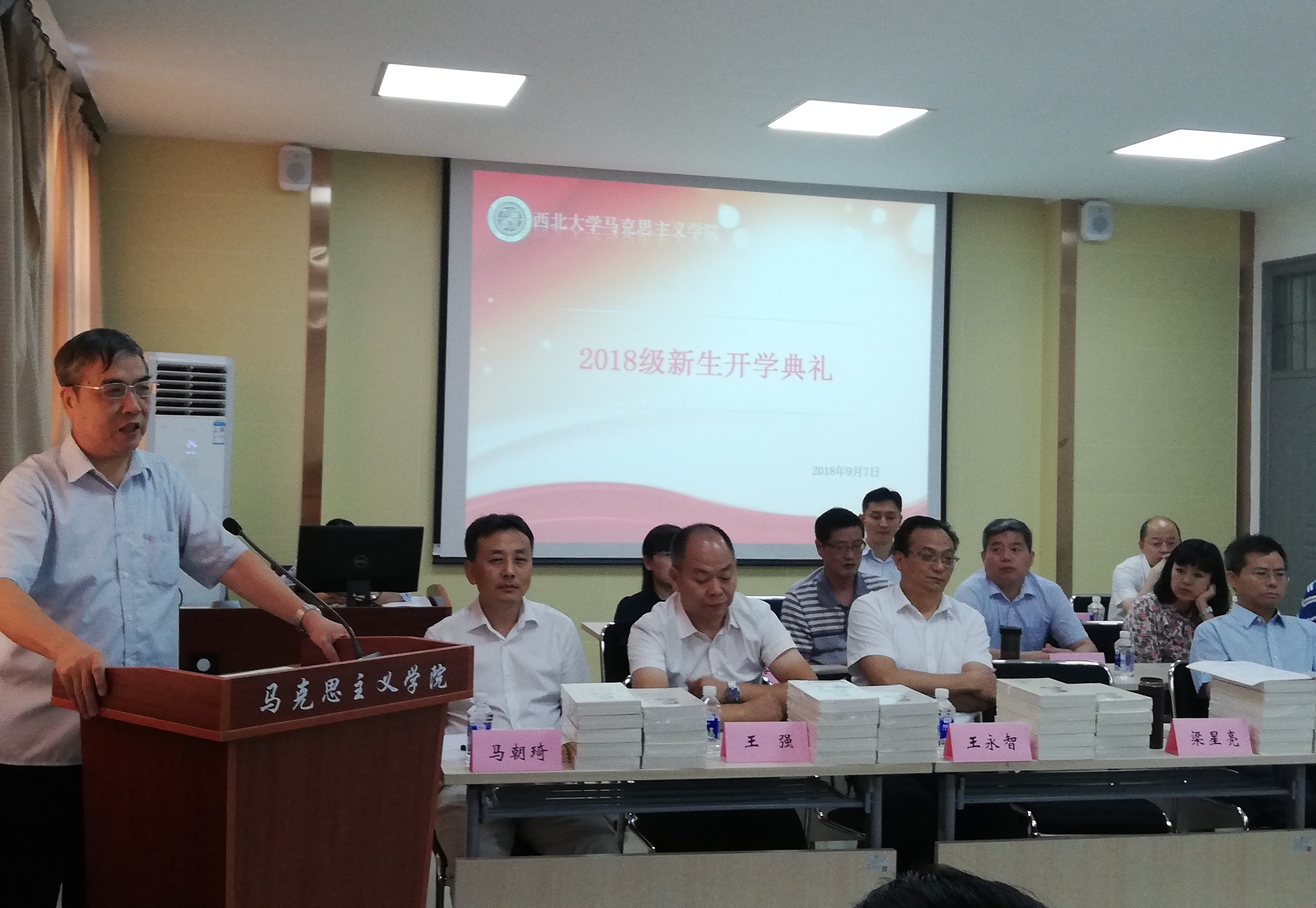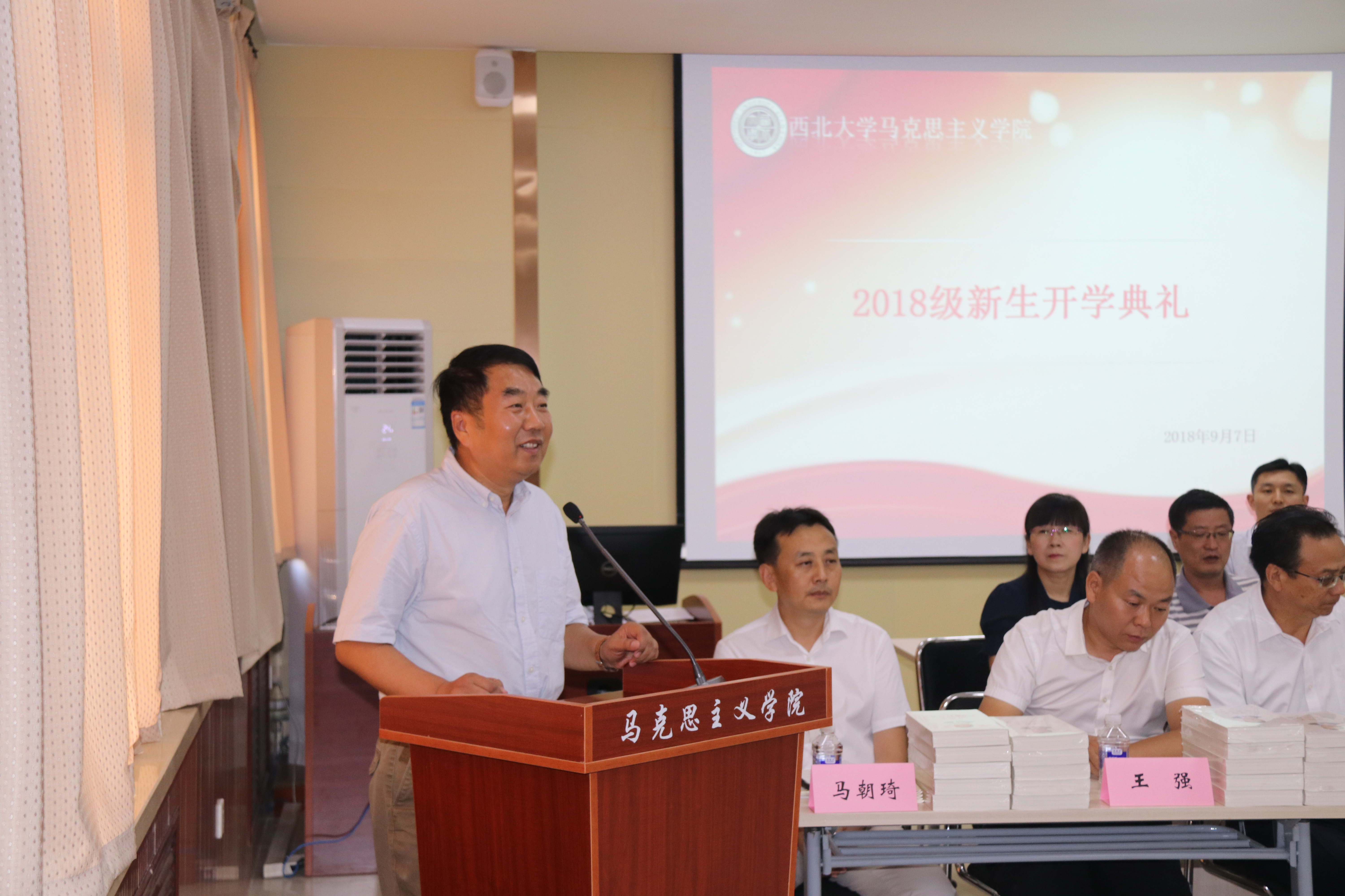 梁星亮教授发表讲话,他指出2018年是马克思主义学院的大喜之年,马克思主义一级博士点申报成功、马克思主义学院成立并迎来了朝气蓬勃的一届新生,这为学院的发展带来新的希望。同时梁星亮教授结合西大百年历史,风雨历程勉励新一届学生做到向往西大、热爱西大、认同西大、认知西大、记忆西大,传承公诚勤朴的西大精神,坚持“守正”的道德操守,践行张载精神和延安精神,做优秀的西大学子。