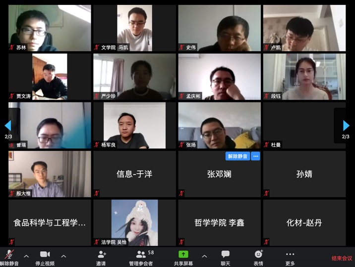 曹建军副教授首先从教学目标、本学期工作要点、网上教学方法辅导、近期教学任务四个方面对本学期的形势与政策课程教学作了整体安排。赵沛副教授的专题报告《新冠疫情让我们看到了什么》,从“禽”与“兽”与疫情的关系说起,对比非典和新冠,分析了抗“疫”中的社会主义制度优势。辅导员陈露、梁靖分别以《党旗飘扬破难关 大爱无疆佑中华》和《这场战疫,我们该怎么战》为题,做了针对性较强的专题教学示范。董国强部长在主持备课会时强调,辅导员要理解当前形势,讲好、讲透、讲深本学期的“形势与政策”课。