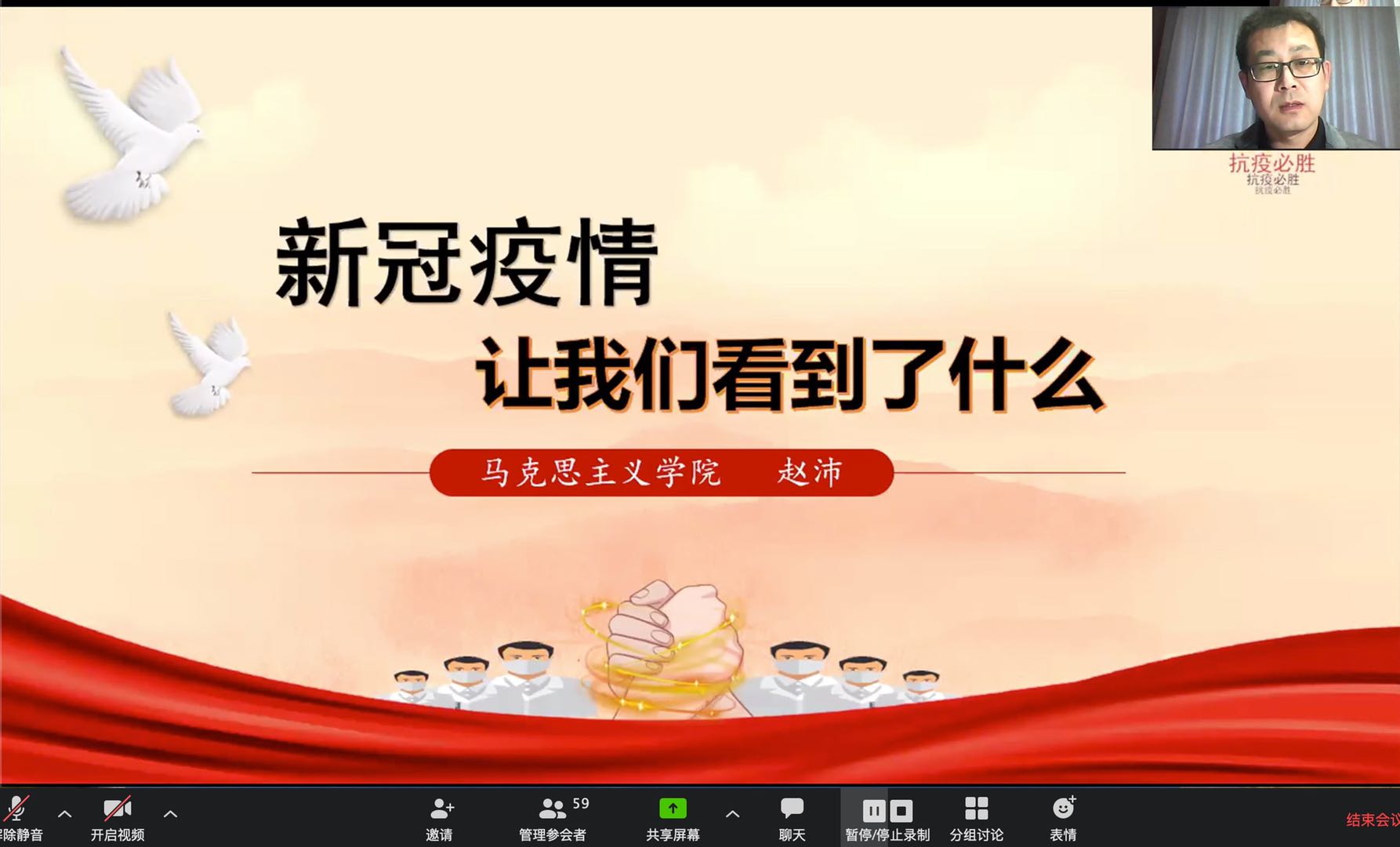 3月7日下午,为传达和贯彻习近平总书记关于新冠肺炎疫情防控工作一系列重要讲话和指示精神,我院联合学生工作部召开形势与政策课网络集体备课会。备课会由学工部董国强部长主持,我院王强院长、教学副院长李志松、形势与政策教研室主任曹建军、副主任赵沛、本学期承担“形势与政策”课教学任务的院(系)学生工作负责人和辅导员共60余人参加了会议。