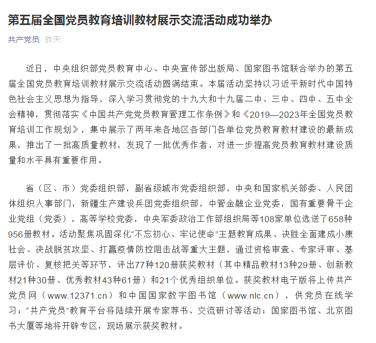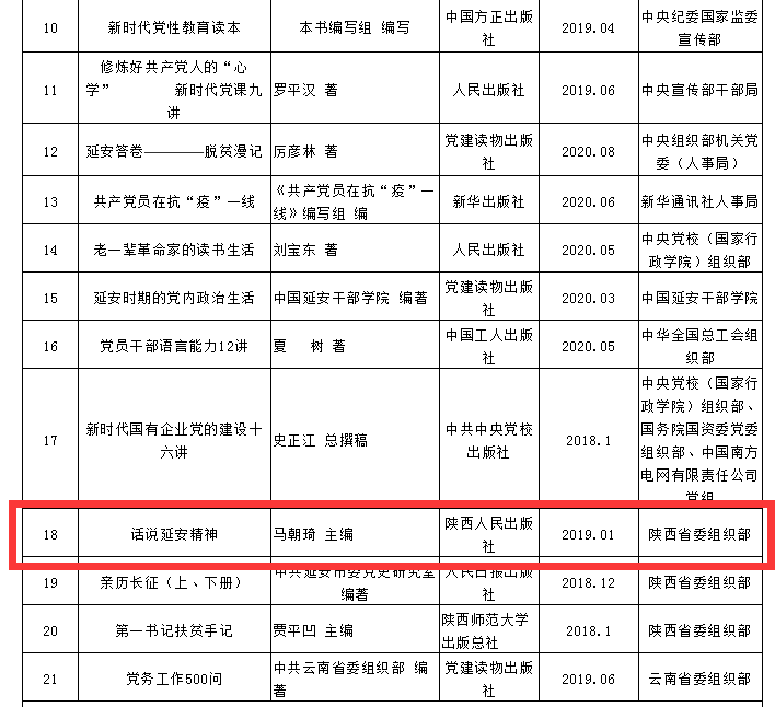 《话说延安精神》是我校延安精神与党的建设研究院长期践行习近平总书记“孜孜以求、精益求精的精神”打造的学术精品。据悉,本次活动共有省(区、市)党委组织部、副省级城市党委组织部、中央和国家机关部委、人民团体组织人事部门、新疆生产建设兵团党委组织部、中管金融企业党委、国有重要骨干企业党组(党委)、高等学校党委、中央军委政治工作部组织局等108家单位选送作品参展,计658种956册教材。《话说延安精神》能够从中脱颖而出,彰显了我校延安精神团队长期秉承的学术特色和深厚的研究实力。今后延安精神与党的建设研究院要按照习近平总书记2020年来陕讲话精神,进一步凝聚力量,深耕学术,推动延安精神研究再上新的水平。