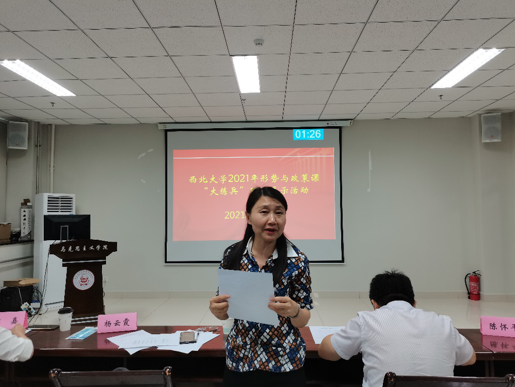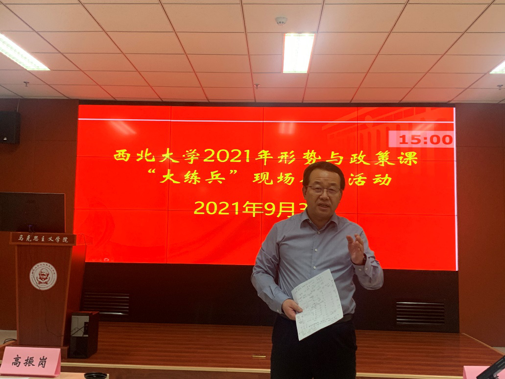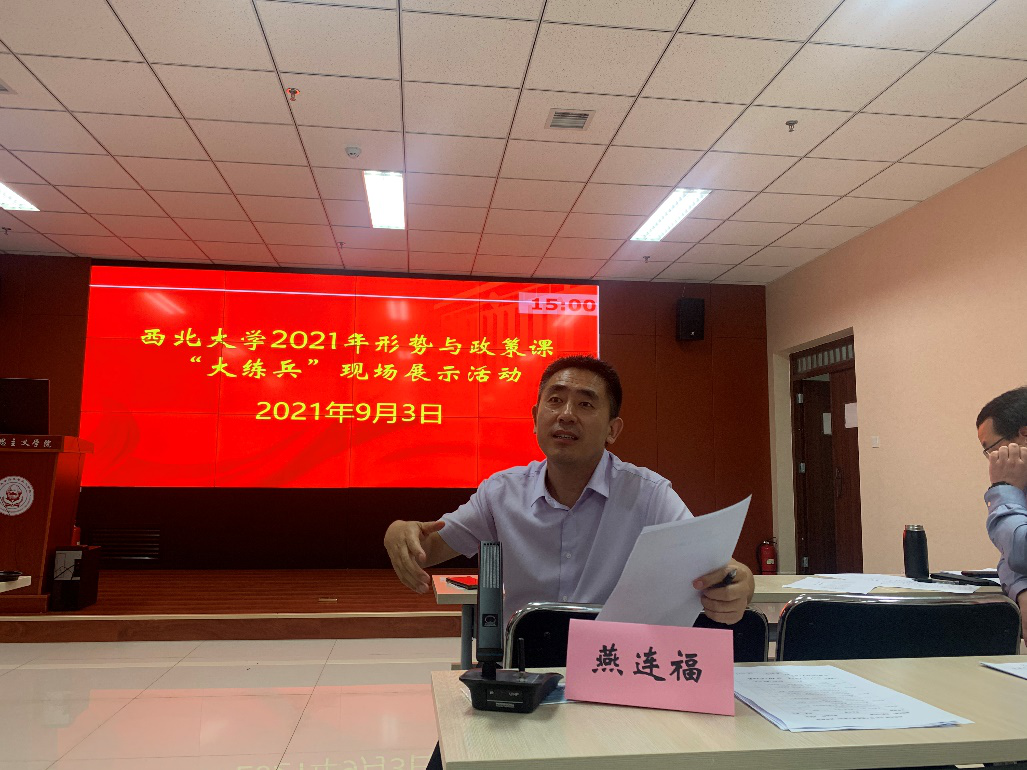 最后,所有参赛选手集合在第一会场,燕连福教授进行了总结,宣布了第一会场的前三名。西北大学学工部部长董国强指出,本次活动最大的意义是学习不是比赛,要注意思政课的属性问题、内容选题和课程设计问题,要解决学生的思想问题、三观问题,多锻炼、多历练,加强理论学习,从理论学习中汲取力量和智慧。