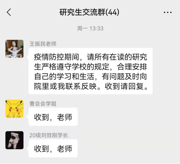 二是抓好导师队伍,导师全面参与学生疫情防控管理。院党委要求全体博、硕导切实负起责任,全面参与、积极配合学院做到学生管理“不漏一人”。学院将全体学生分为6组,由6名院领导带队和导师各负责一组,每个组的工作任务为:一是及时传达各级疫情防控工作要求;二是做好学生思想教育工作,引导学生以积极心态应对疫情,合理安排学习生活;三是结合教学科研要求,每周至少开展一次形式灵活的线上活动;四是了解学生实际困难和需求,及时协调、解决。做到及时关心慰问学生,及时掌握学生思想状况,让学生真切感受到来自学院和导师的关爱和温暖。