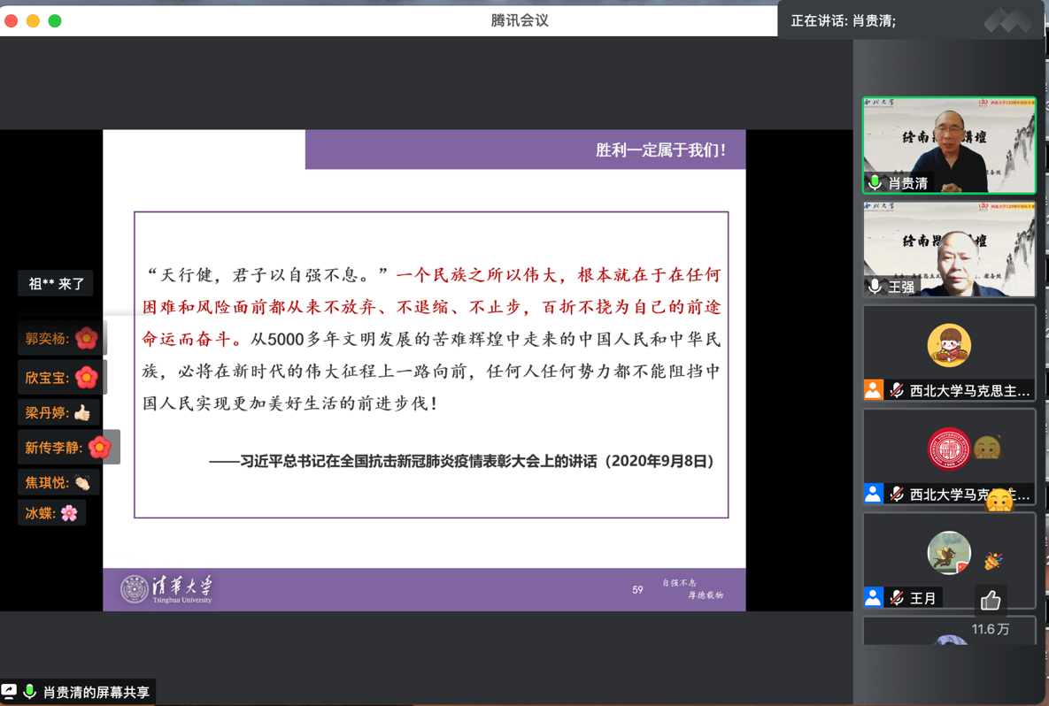 报告会总结环节,王强教授对肖贵清教授的精彩报告表示了感谢。他指出,肖贵清教授的报告有政治高度、理论深度和现实温度,价值导向性强,正能量满满。肖教授报告中一个又一个温情满满、感人至深的故事分享让我们看到了优秀思政课老教师的标准与示范,期待着疫情过后肖教授能够再来西北大学进行线下讲座,为广大师生更好地讲述新时代抗疫英雄的故事。
