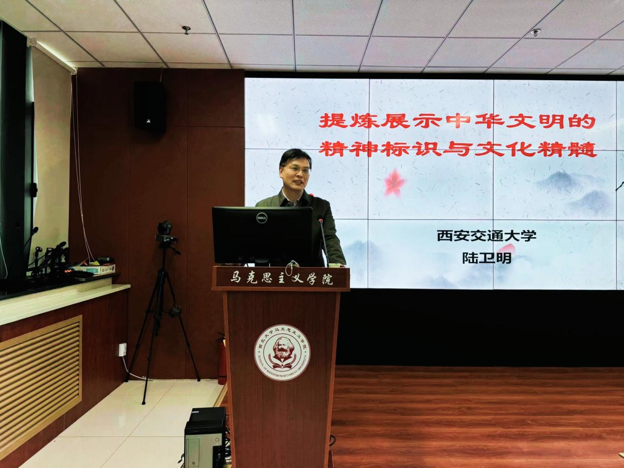 4月2日下午,全国高校思政课名师工作室(西安交通大学)负责人、国家社科基金重大项目“中华优秀传统文化与科学社会主义价值观主张高度契合性研究”首席专家、西安交通大学中国马克思主义研究所所长、陕西省中国特色社会主义理论体系协同创新中心副主任、陕西省中共党史学会副会长、陕西省师德标兵陆卫明教授做客我校“名家讲坛”,为我院师生作了题为《中华文明的精神标识与文化精髓》的专题讲座。讲座由我院院长何博教授主持。