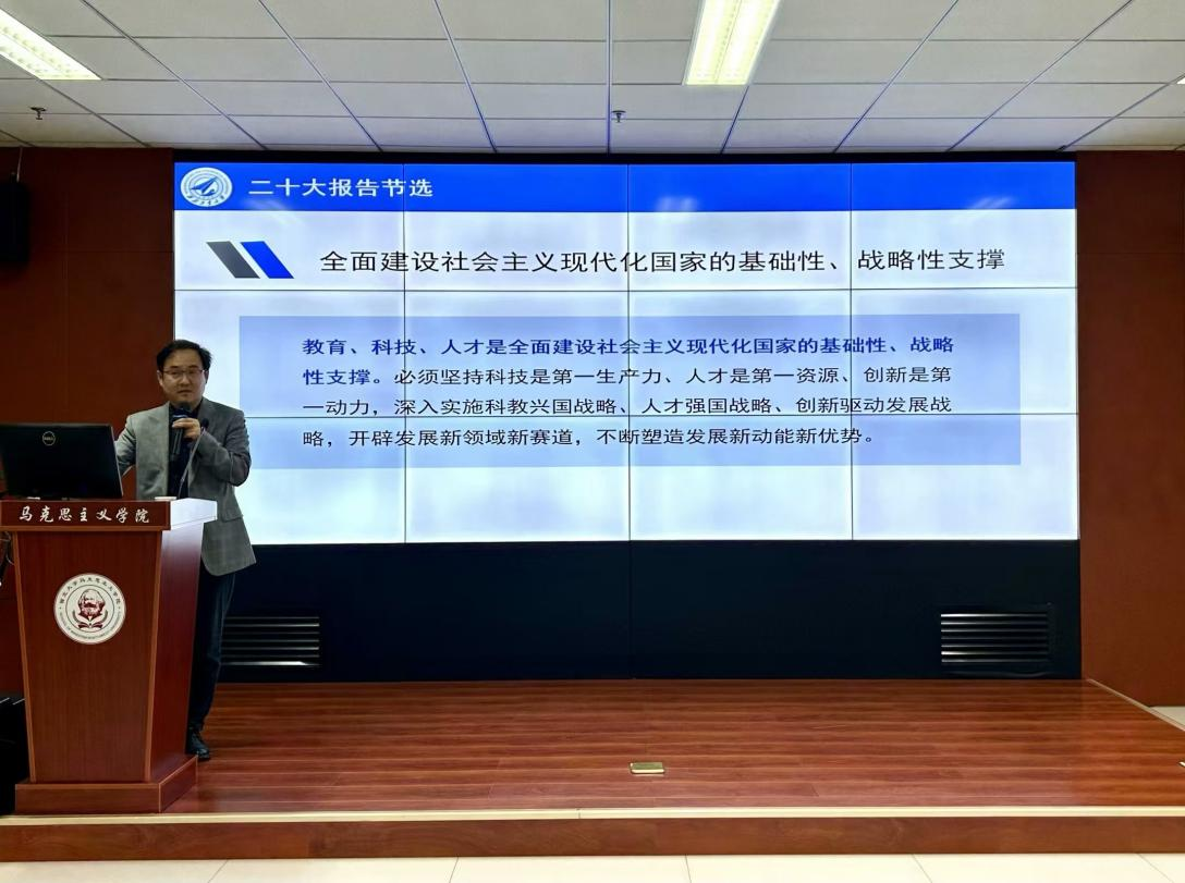 首先,张云龙对党的二十大精神及习近平总书记关于科技创新的重要论述进行了深入解读,系统阐释了“科技创新”与“新质生产力”这两个核心概念,并强调了二者在推动国家发展与社会进步中的关键作用。其次,他回顾了新时代我国在科技创新领域取得的显著成就,认为这些成就激发了国民的民族自豪感和科技自信心。同时,他强调必须保持清醒的认知,意识到我国在科技领域仍面临一些“卡脖子”难题,应有忧患意识。最后,他指出,高校作为教育、科技、人才的交汇点,是实现重大科技突破的关键策源地。他勉励同学们发挥各自的专业优势,为推动科技创新贡献青春力量。