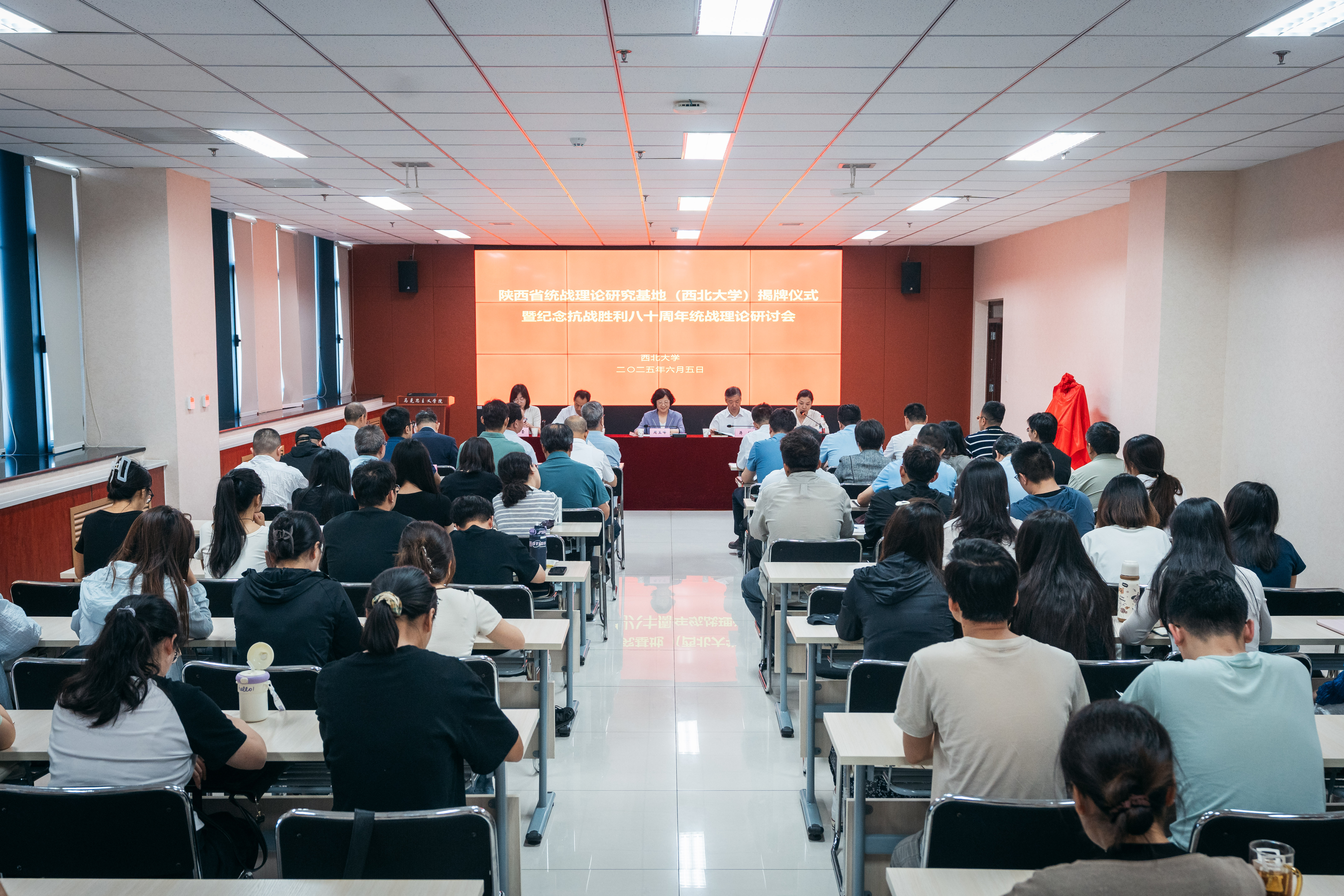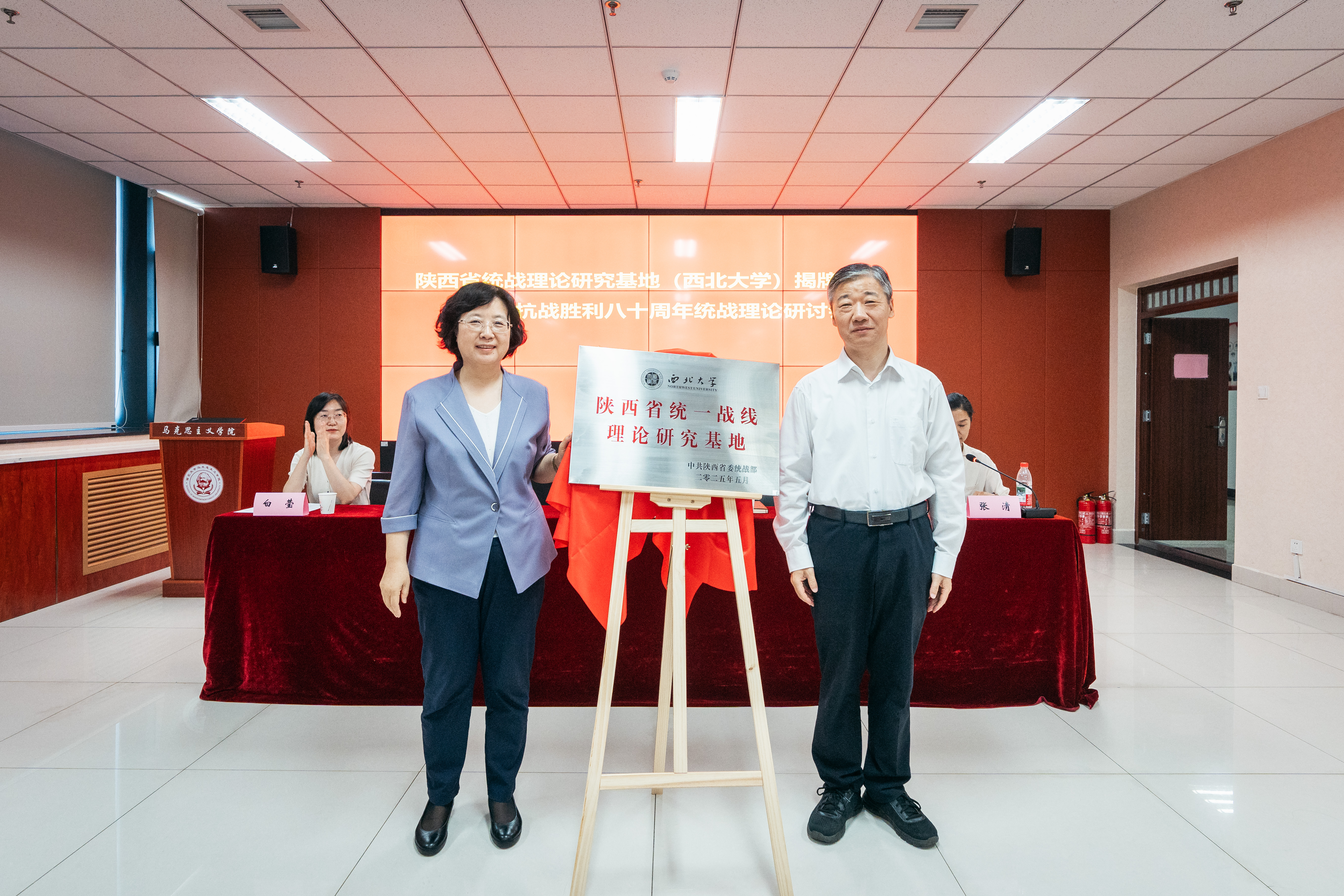 6月5日,陕西省统战理论研究基地(西北大学)揭牌仪式暨纪念抗战胜利八十周年统战理论研讨会在我校长安校区举行。省委统战部常务副部长周玉峰、副部长虞浩桂,省委教育工委统战部副部长白莹,我校党委书记蒋林,党委副书记张清,党委常委、统战部部长董国强出席会议。省委统战部研究室(宣传办),陕西省统一战线理论研究基地(陕西师范大学),校内有关单位、民主党派、侨联负责人以及师生代表参加会议。